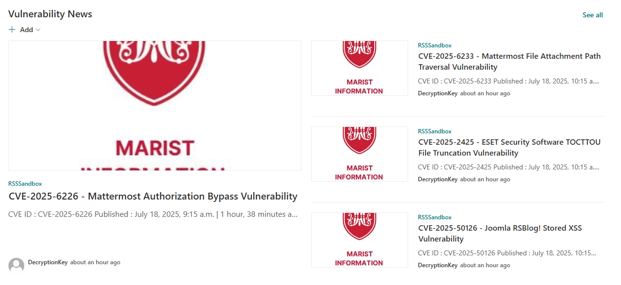 This solution is ideal for organizations that want to auto-publish content from trusted external sources, monitor industry updates or vulnerability advisories, and keep internal teams informed without manual posting.